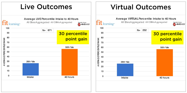 Your child will work one-on-one with a learning coach during their sessions. But, our online enrollments don’t look like traditional tutoring or homework help. Our coaches are really good at helping your child learn the building blocks for academic success in a fun, new way. And it works. Fit learners typically gain 1-2 years of academic progress in as little as 40 hours. And, as shown in the graphs below, the learning outcomes from Fit’s online tutoring are just as impactful as those from live tutoring.