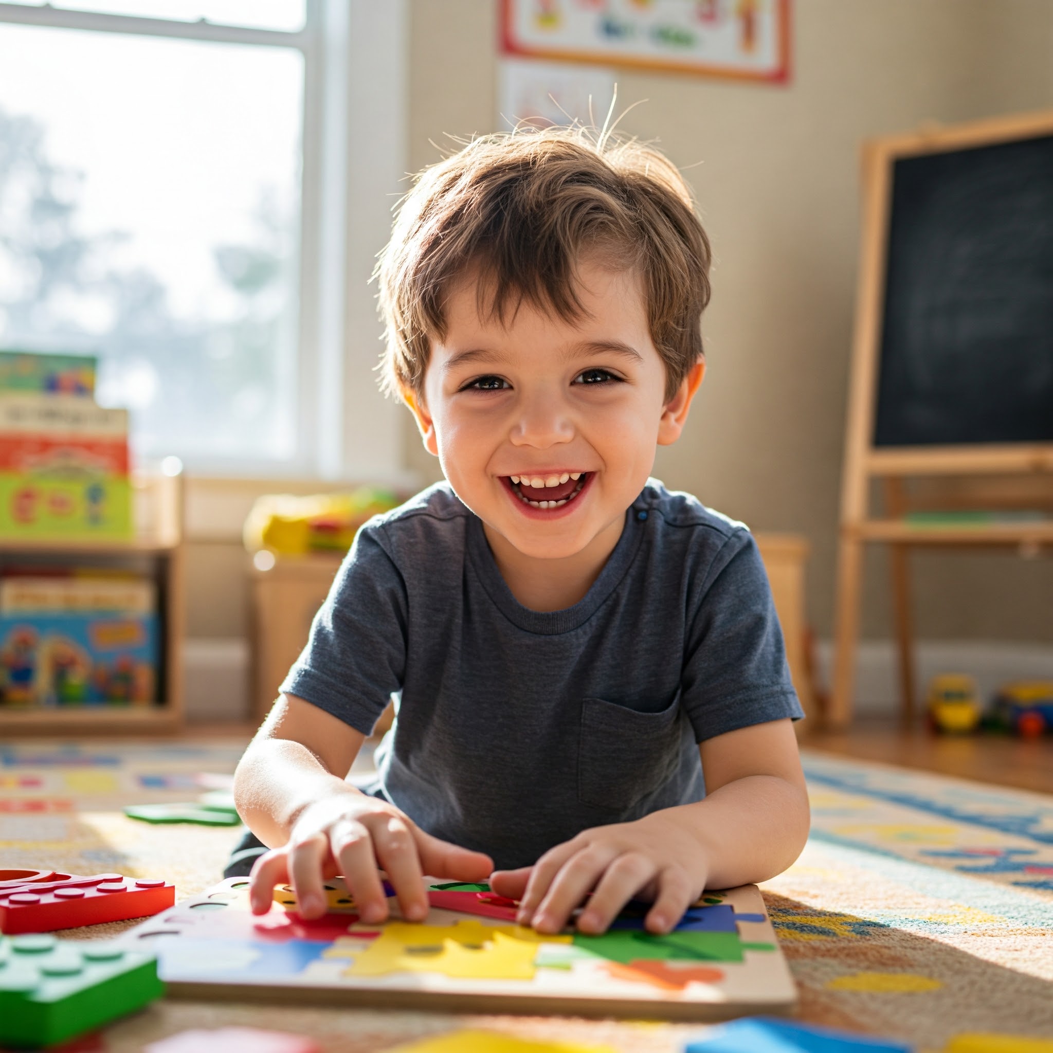 smiling young boy looks up from his puzzleFit’s Target Foundational Skills