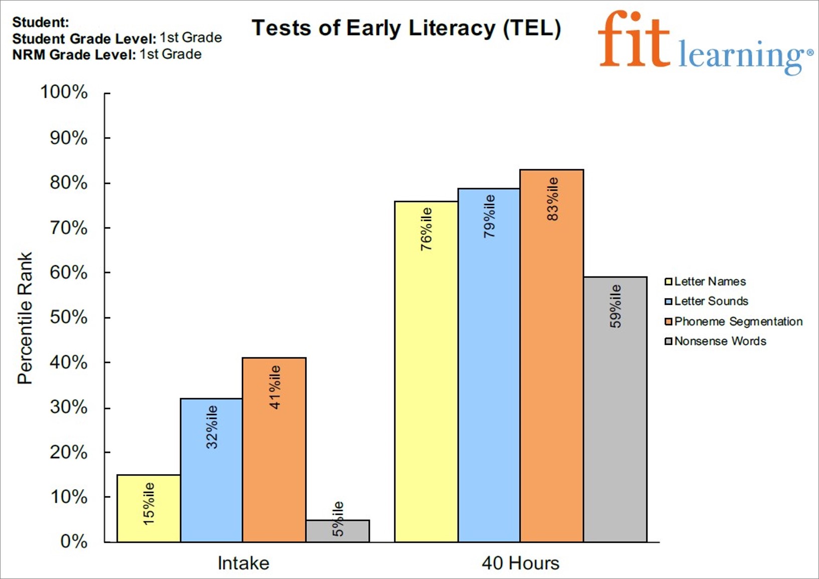In the graph above, the learner improved their early literacy skills significantly in four areas. They progressed from the 15th to the 76th percentile for letter names, from the 32nd to the 79th percentile for letter sounds, from the 41st to the 83rd percentile for phoneme segmentation (meaning the ability to break words down into individual sounds), and from the 5th to the 59th percentile for nonsense words.
