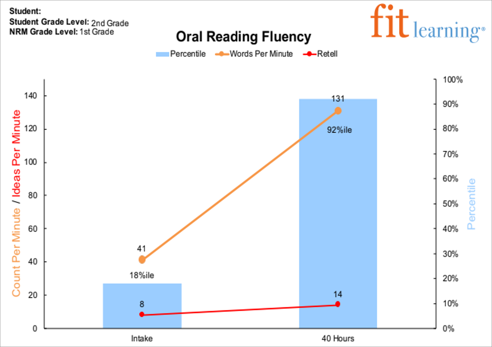 Finally, in the graph above, a second-grade learner improved their oral reading fluency from 18th to 92nd percentile as compared to same-aged peers.